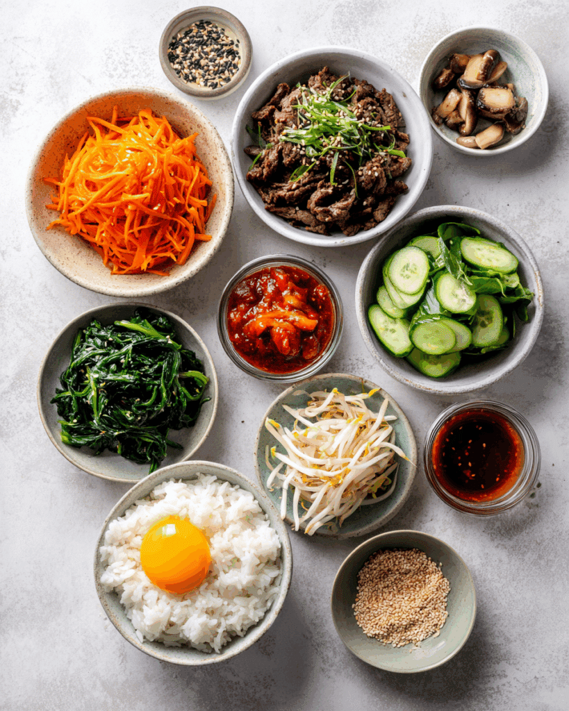 The charm of this bowl lies in its contrasts. The rice is soft and warm, the beef rich and tender. Crunchy carrots meet silky spinach. That runny egg yolk pulls everything together into a creamy, spicy, savory masterpiece. Gochujang adds a deep heat while sesame brings warmth and nuttiness.