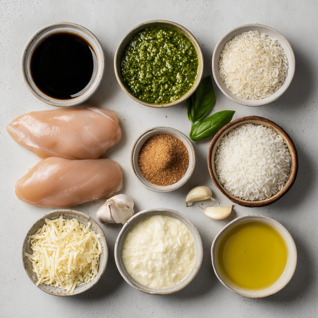This dish was born from one of those end-of-the-week fridge discoveries. I had some leftover homemade pesto, a bit of balsamic vinegar, and chicken breasts defrosted but uninspired. With a little experimentation, what emerged was a dish so satisfying that it became a regular weeknight favorite. There’s something magical about the way the sharp balsamic cuts through the rich creaminess of the rice, creating a balanced, addictive bite. It reminds me of family dinners that start casual and end with everyone scraping their plates.