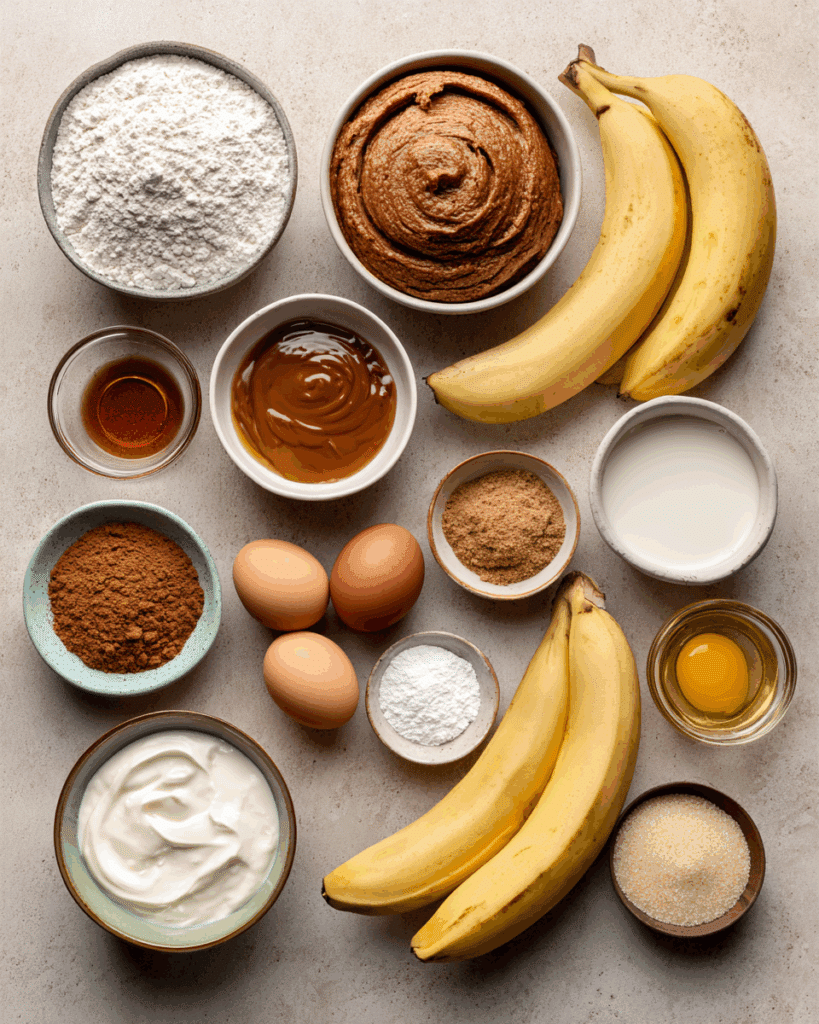 - Combine Ingredients: In one bowl, whisk flour, baking soda, salt, and cinnamon. In another, mix mashed bananas, sugars, eggs, yogurt, vanilla, and oil until smooth.