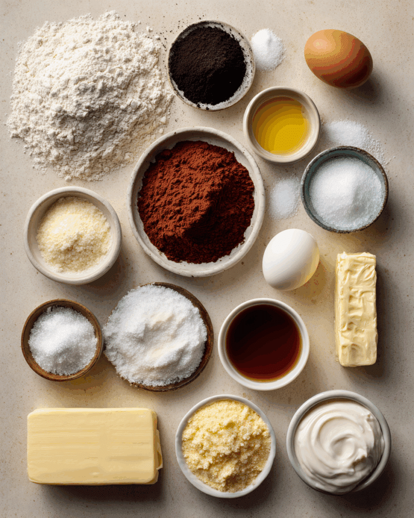 - Black Cocoa Powder: 1/4 cup – Adds deep color and bold chocolate flavor.