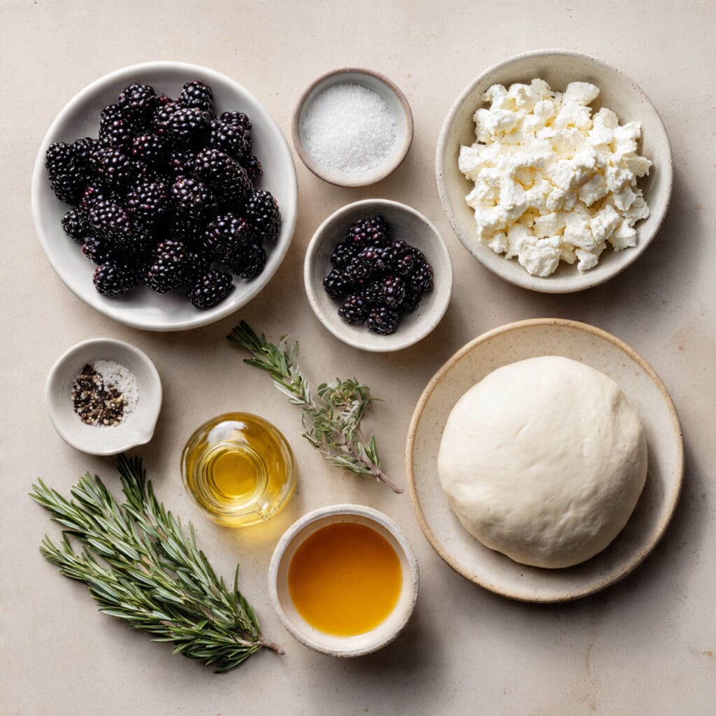 - Brush dough with olive oil. Top with crumbled goat cheese and blackberries. Sprinkle with rosemary, salt, and pepper.