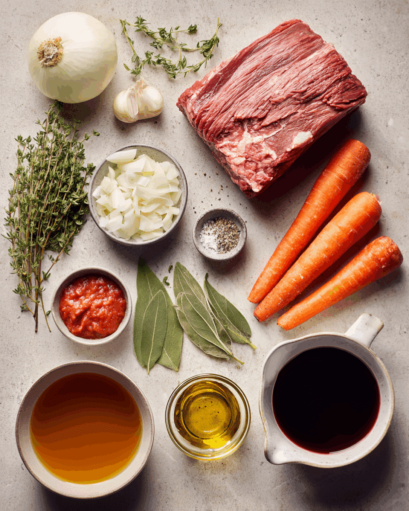 - Combine Ingredients: Season brisket with salt and pepper, sear in olive oil until browned, and set aside.