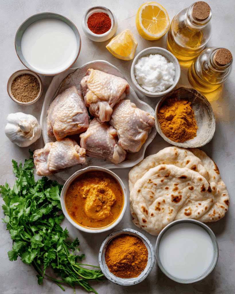 - Plain Yogurt: 1 cup. Helps tenderize and flavor the chicken during marination.