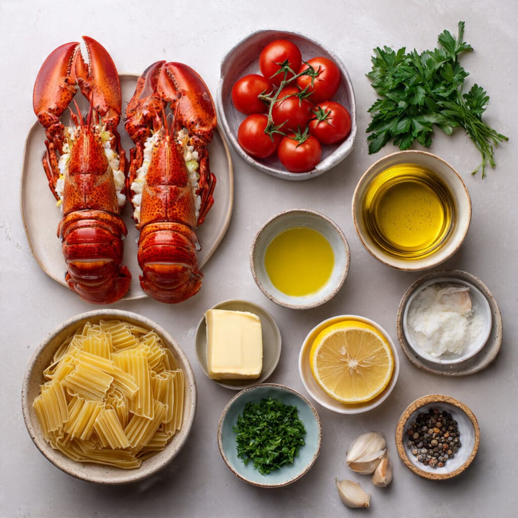 A rich and comforting pasta dish featuring tender lobster, buttery sauce, and sweet cherry tomatoes, perfectly balanced with garlic, lemon, and fresh herbs.