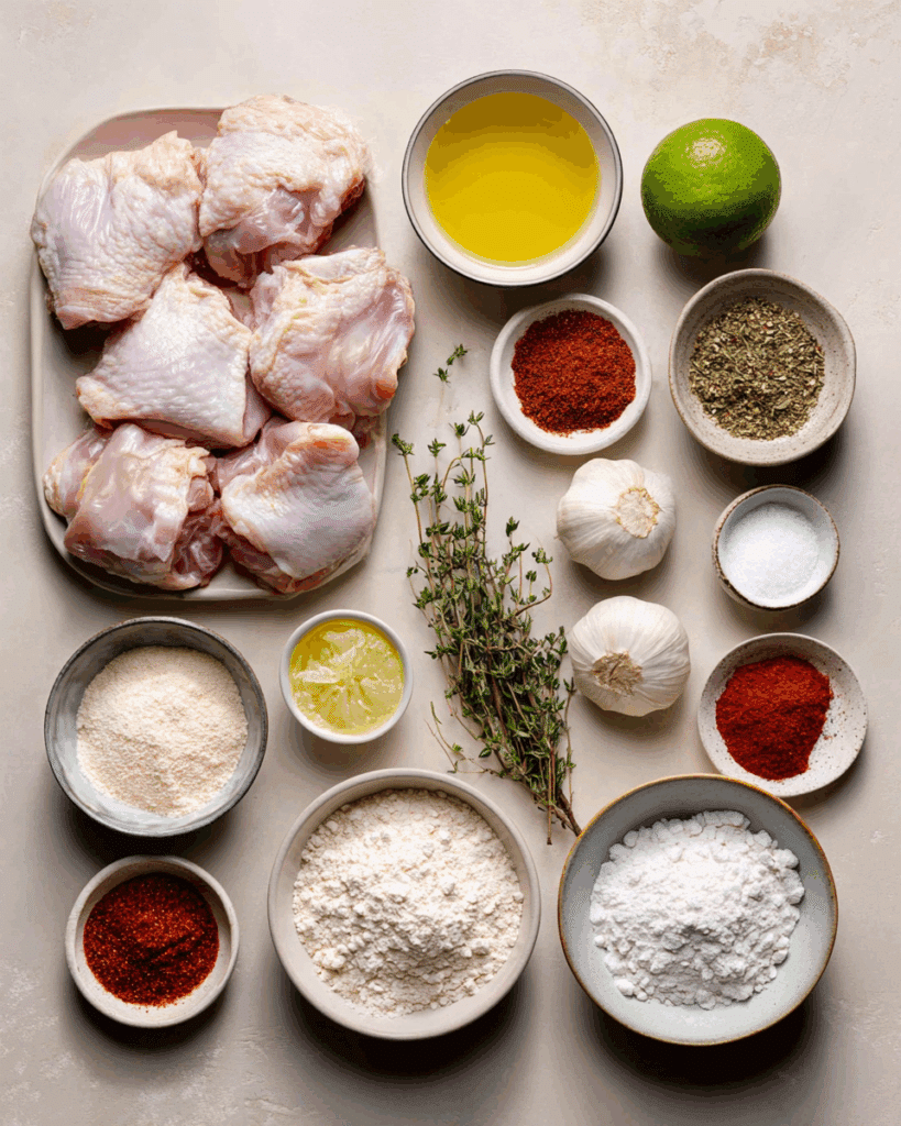 The real magic of this dish lies in its contrasts. The crust is shatteringly crisp, almost airy thanks to cornstarch and baking powder. Inside, the chicken is juicy, aromatic, and deeply flavored from the marinade. That hint of lime, the heat of the pepper, and the earthiness of thyme come together in a bite that’s warm, spicy, and slightly sweet.