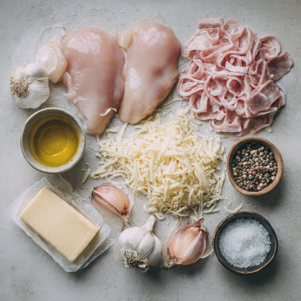 On each flattened chicken fillet, lay 2 slices of ham and a generous handful of shredded mozzarella. Sprinkle with a little garlic, salt, and pepper. - Prepare Your Cooking Vessel: