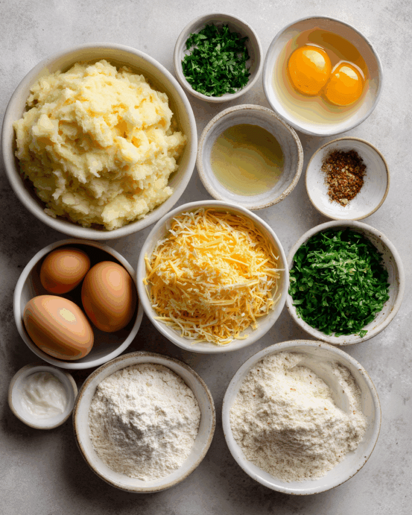 - Mashed Potatoes: 2 cups, cold and firm. Acts as the creamy base and holds everything together.