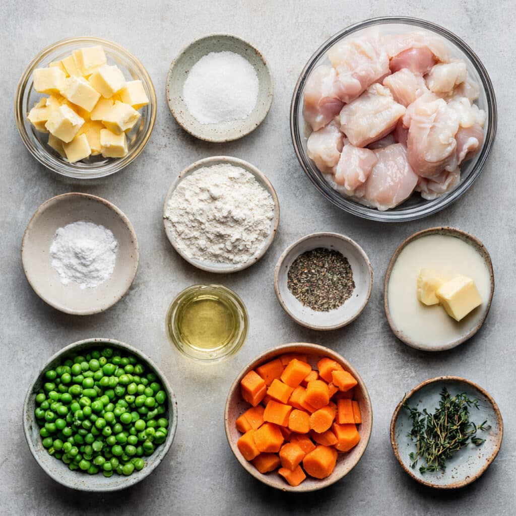 - Assemble the Dish: Layer diced chicken, peas, carrots, and onion evenly over the butter. Sprinkle dried thyme over the top. Carefully pour chicken broth over the mixture. Gently spoon the biscuit batter over everything without stirring.