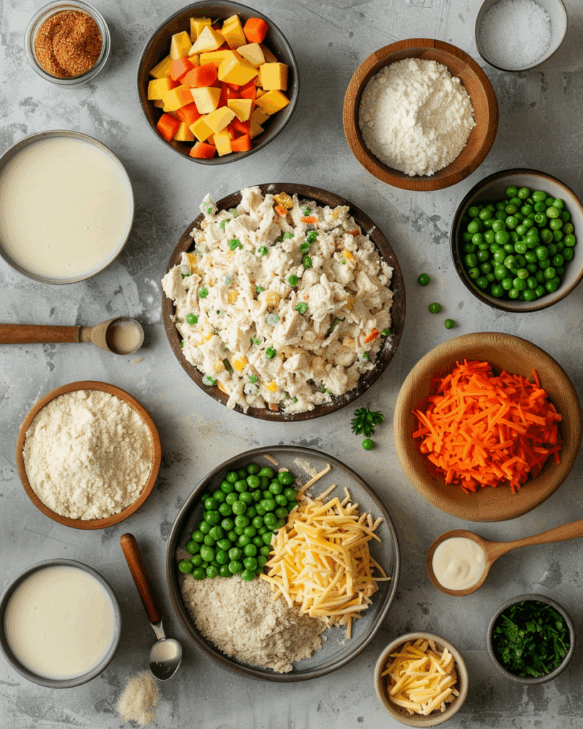 - Combine Ingredients: In a skillet, melt butter, whisk in flour, then slowly add broth and milk until thickened. Stir in chicken, vegetables, and seasonings.