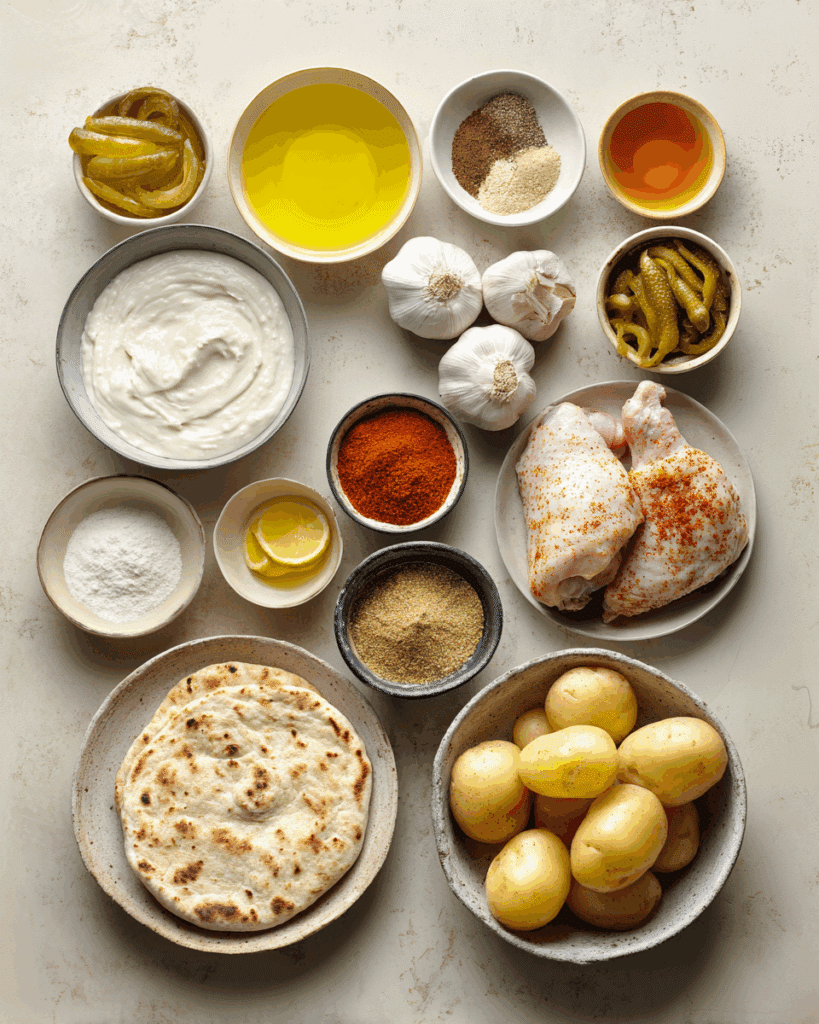 - Assemble the Dish: While the chicken cooks, fry or bake your potato fries until golden and crispy. Warm the flatbreads and prep your garlic sauce and pickles.