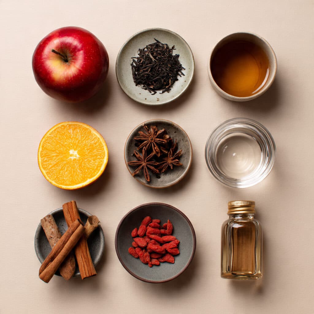 A warm, fragrant fruit tea made with sliced apple, orange, black tea, cinnamon, star anise, goji berries, and honey. It is light, cozy, and beautifully aromatic.