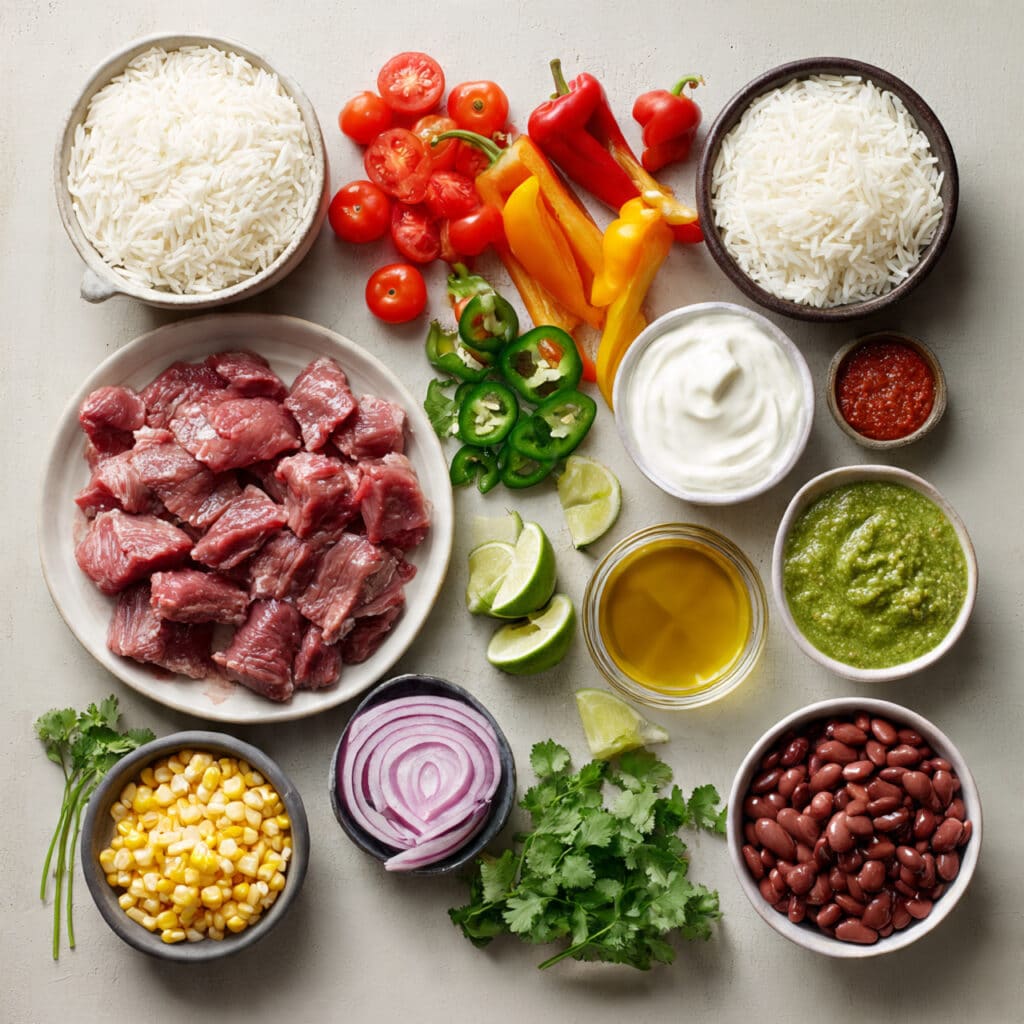 - Finishing Touches: Assemble bowls with a base of cooked rice, then top with steak, veggies, beans, corn, tomatoes, jalapeños, sour cream, salsa, and cilantro.