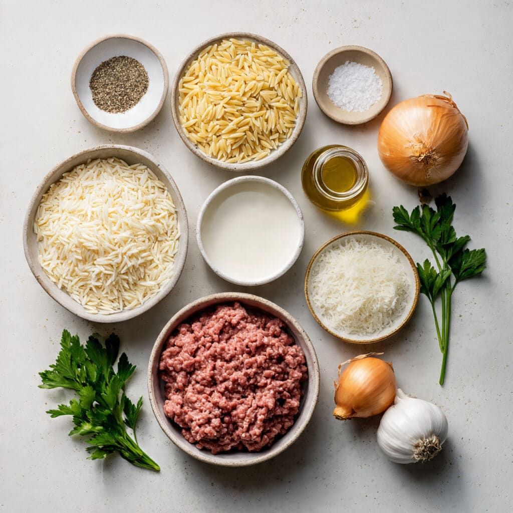 A cozy one-pan pasta dinner with tender orzo, savory ground beef, and a silky parmesan cream sauce finished with fresh parsley.