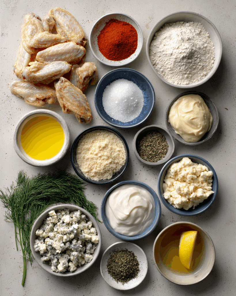 - Assemble the Dish: Mix melted butter and hot sauce in a bowl. For the ranch, whisk together mayo, sour cream, blue cheese, garlic and onion powders, lemon juice, herbs, salt, and pepper.