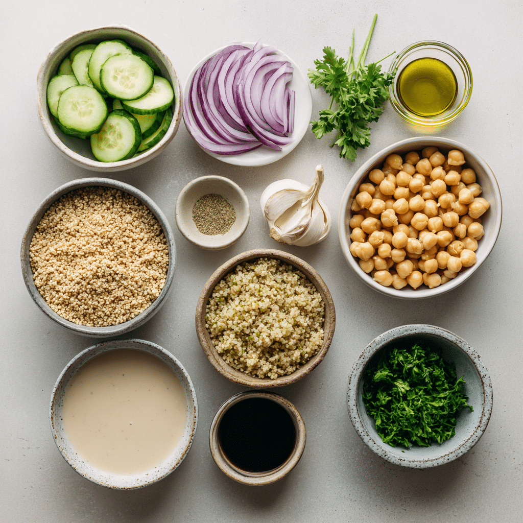 Ingredients in Crispy Quinoa Cucumber Chickpea Salad with Creamy Tahini Balsamic Dressing