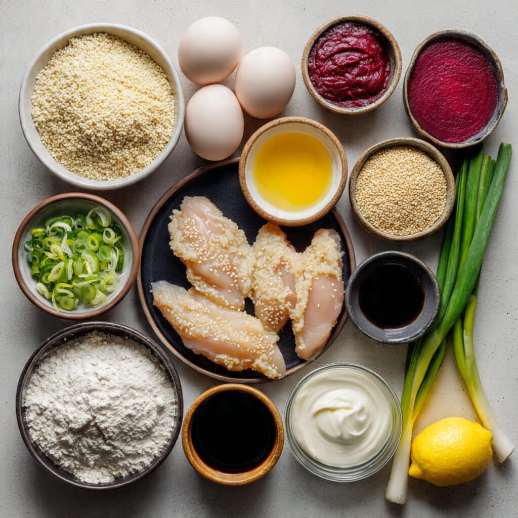 - Dredge chicken in flour, dip in egg, then coat in the sesame-panko mixture.