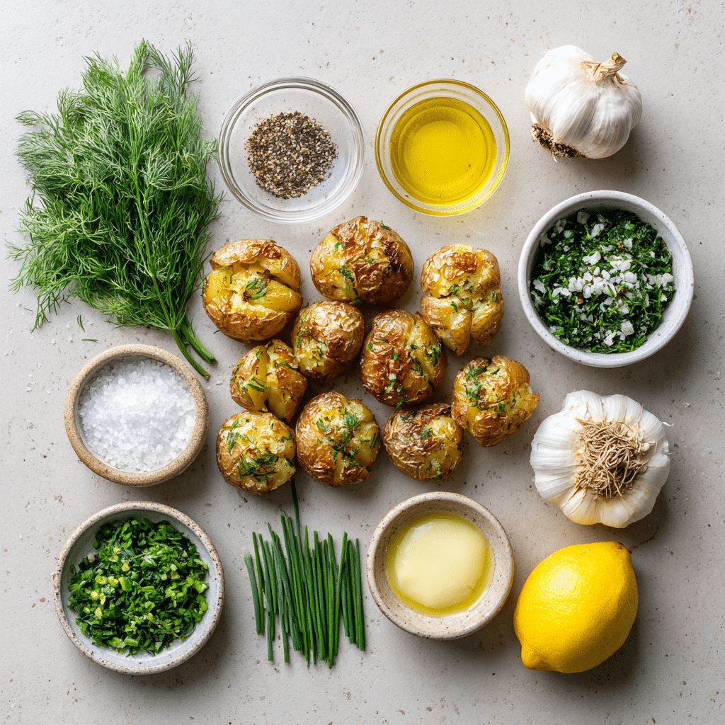 Ingredients in Crispy Smashed Potatoes with Lemon Dill & Chive Dressing