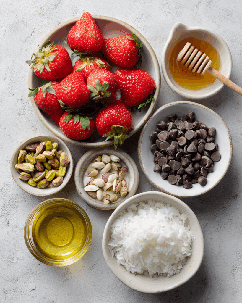 Melt chocolate with coconut oil until smooth. Dip each strawberry to coat fully, letting excess drip off. Place on parchment-lined tray. - Finishing Touches: