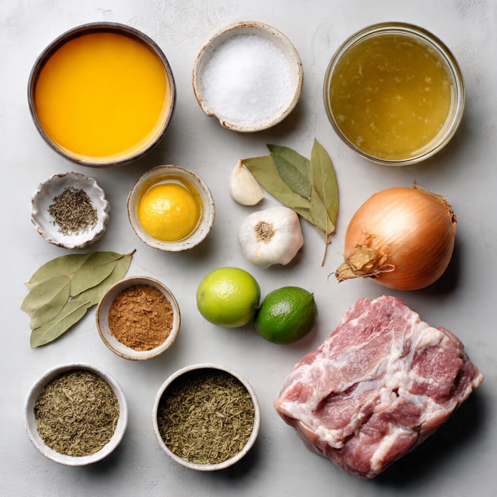 - Combine Ingredients: Add pork shoulder to the crockpot. Pour in orange juice, lime juice, and chicken broth. Sprinkle garlic, onion, cumin, oregano, salt, pepper, and bay leaves over the top.