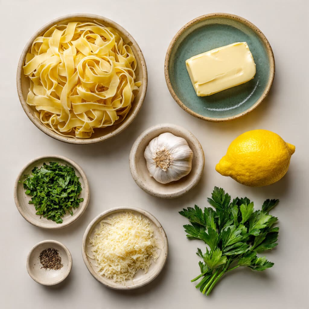 A warm and comforting bowl of fettuccine coated in rich garlic butter sauce, finished with parmesan, parsley, and a hint of lemon for brightness.