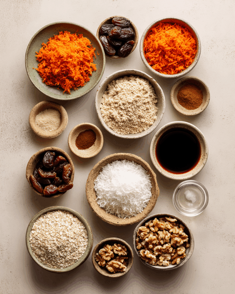 In a food processor, pulse oats until finely ground. Add dates, carrots, almond flour, shredded coconut, walnuts, maple syrup, vanilla, cinnamon, nutmeg, and salt. Blend until a sticky, uniform dough forms. - Prepare Your Cooking Vessel: