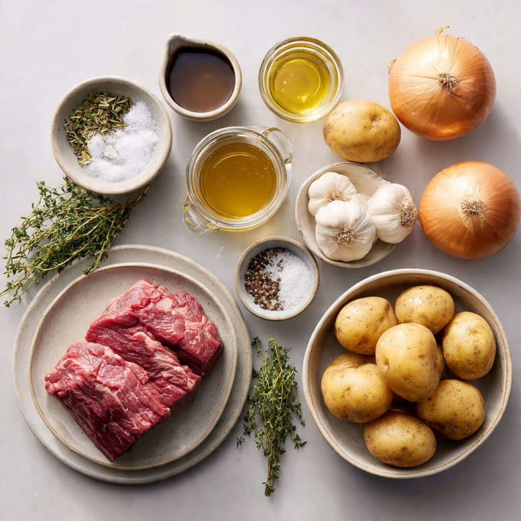 This dish is a symphony of contrasts. The meat becomes fall-apart tender while the potatoes hold their shape and soak up the savory juices. The onions melt into a silky layer of sweetness, while the broth reduces into a glossy, rich gravy that clings to every bite. It’s deeply savory with a hint of tang, sweet onion goodness, and just the right amount of salt and herb.