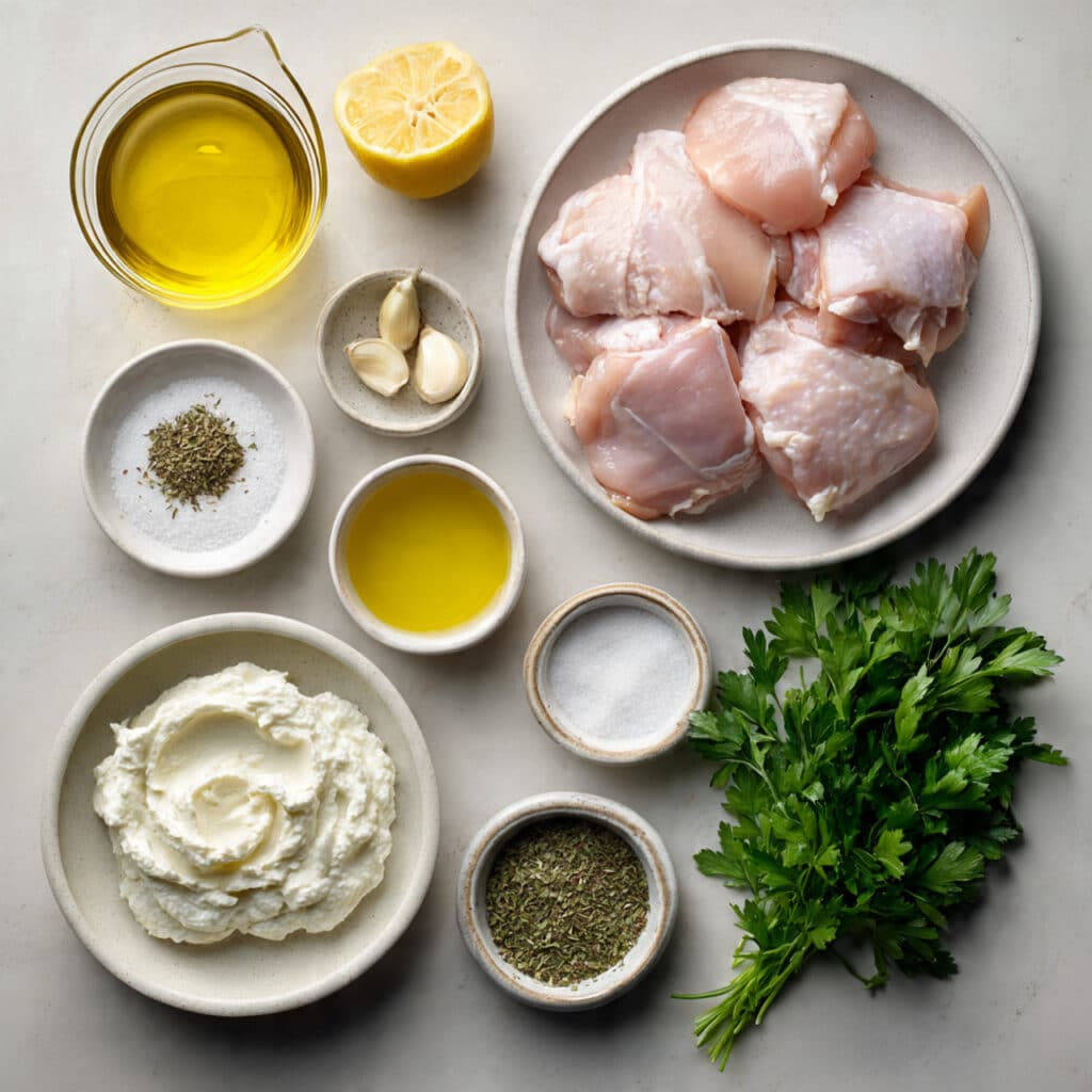 Juicy grilled chicken thighs marinated in olive oil, fresh lemon juice, garlic, and oregano, served with a creamy yogurt and parsley sauce for a bright and satisfying Mediterranean-inspired meal.