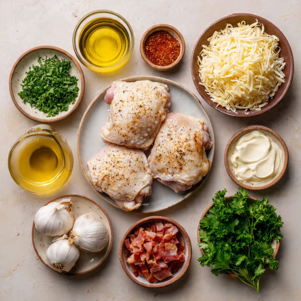 - Assemble the Dish: Place chicken thighs in the dish, spread the creamy mixture over them, then top with cheddar and turkey bacon
