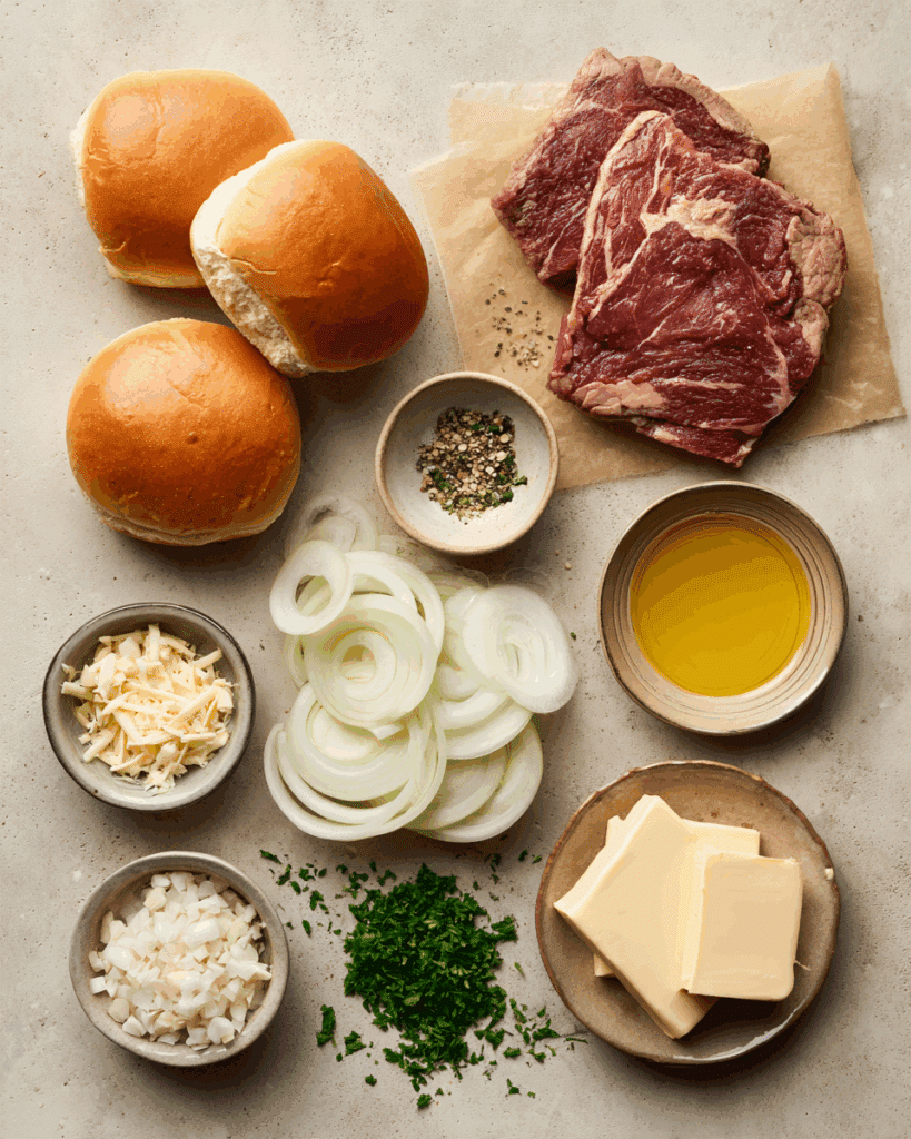 - Steak: 1 pound of ribeye or sirloin, thinly sliced. Brings the savory, juicy base of the sliders.