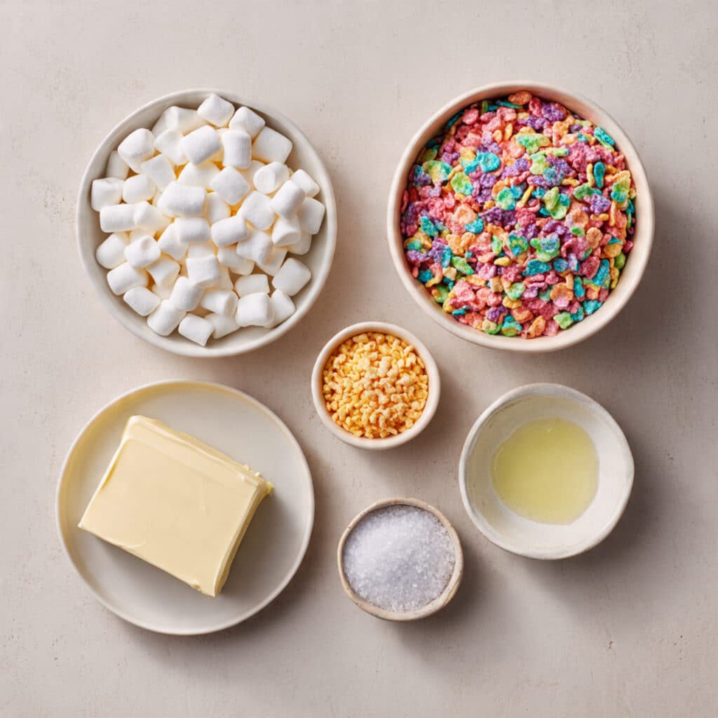 - Colorful Puffed Rice Cereal (like Fruity Pebbles): 5 cups – Adds the crunchy, fruity texture and vibrant color.