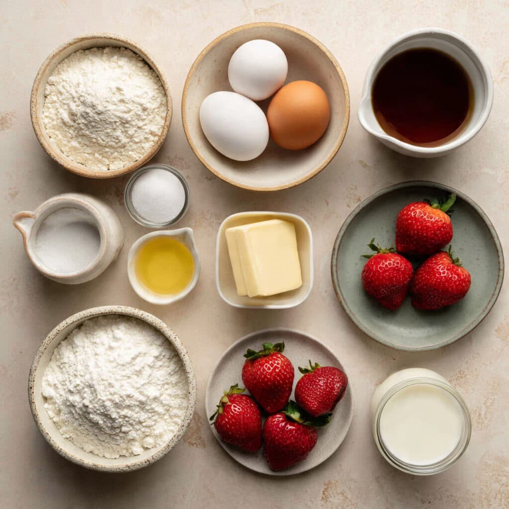 - Sugar: 90 grams – Sweetens both the cake and the whipped cream without overpowering the strawberries.