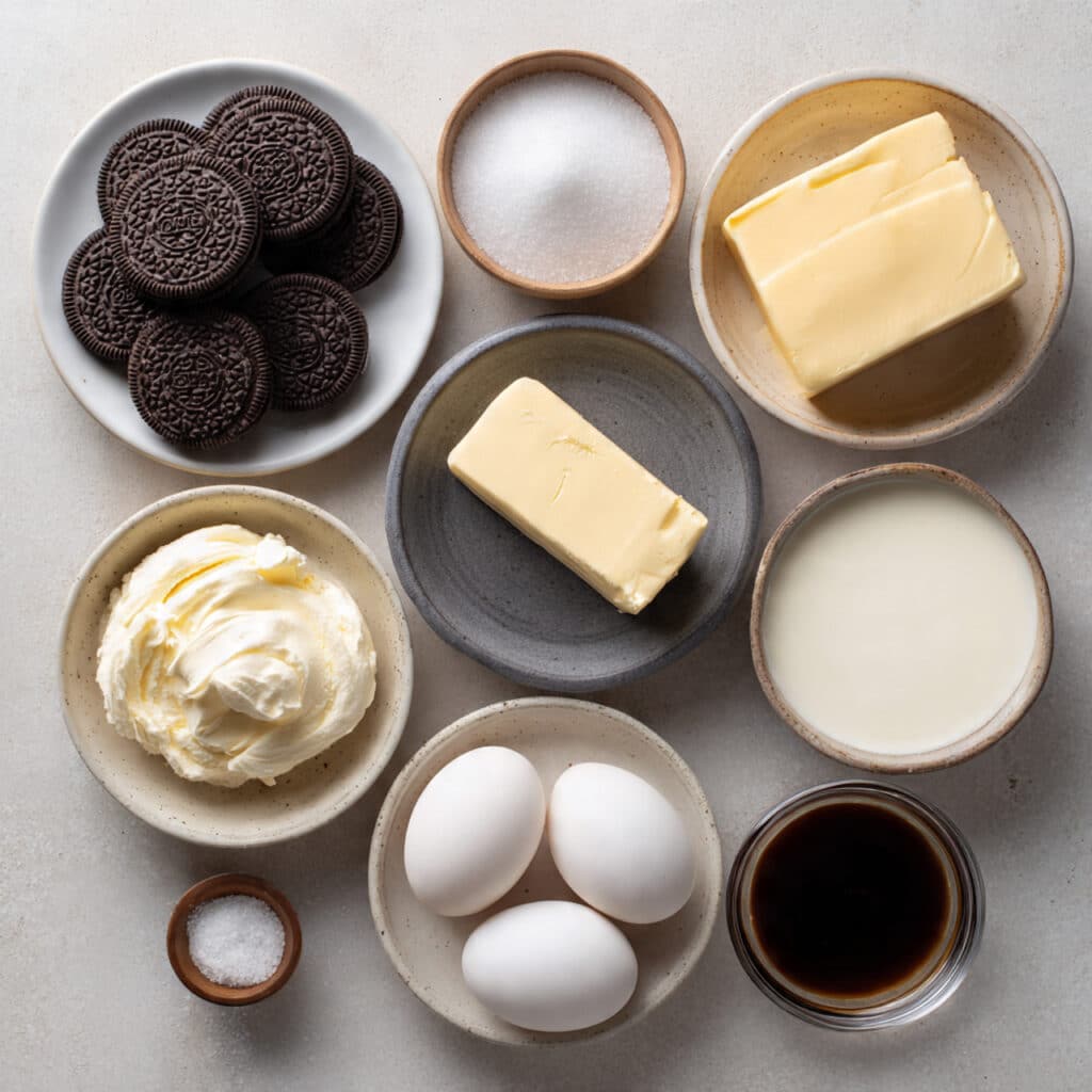 - Oreo Cookies: 24 cookies, finely crushed, they form a deep chocolatey crust with just the right crunch.