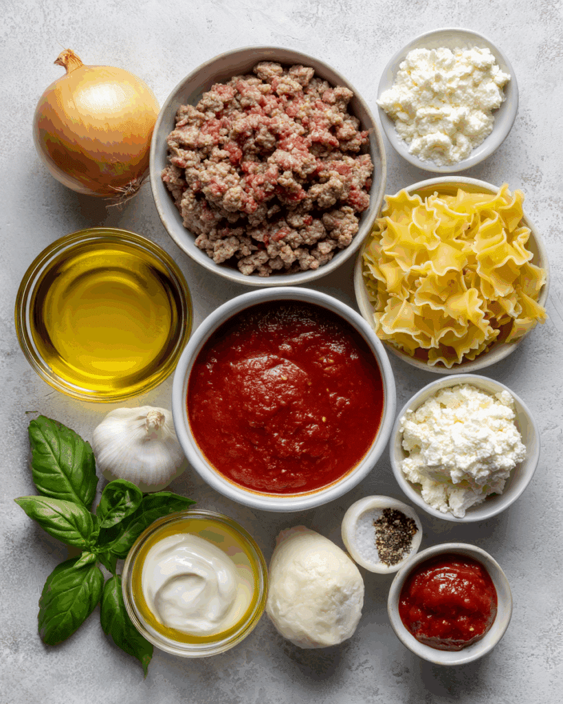 A cozy, comforting bowl of lasagna soup loaded with ground beef, Italian sausage, tender noodles, and rich tomato broth, topped with creamy ricotta and fresh basil. It’s like lasagna in a spoon — easier, faster, and just as satisfying.