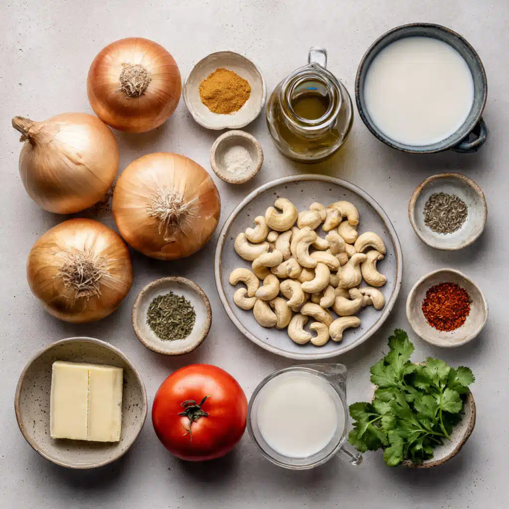 A rich and comforting North Indian style onion curry made with tender baby onions simmered in a silky cashew, tomato, milk, and cream gravy with warm spices.