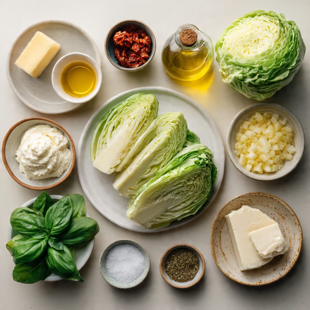 This dish works because every ingredient has a clear job. The cabbage brings sweetness and structure, the dairy makes everything luscious, and the sun-dried tomatoes wake the whole pan up with a little tangy intensity. Here is everything you need.