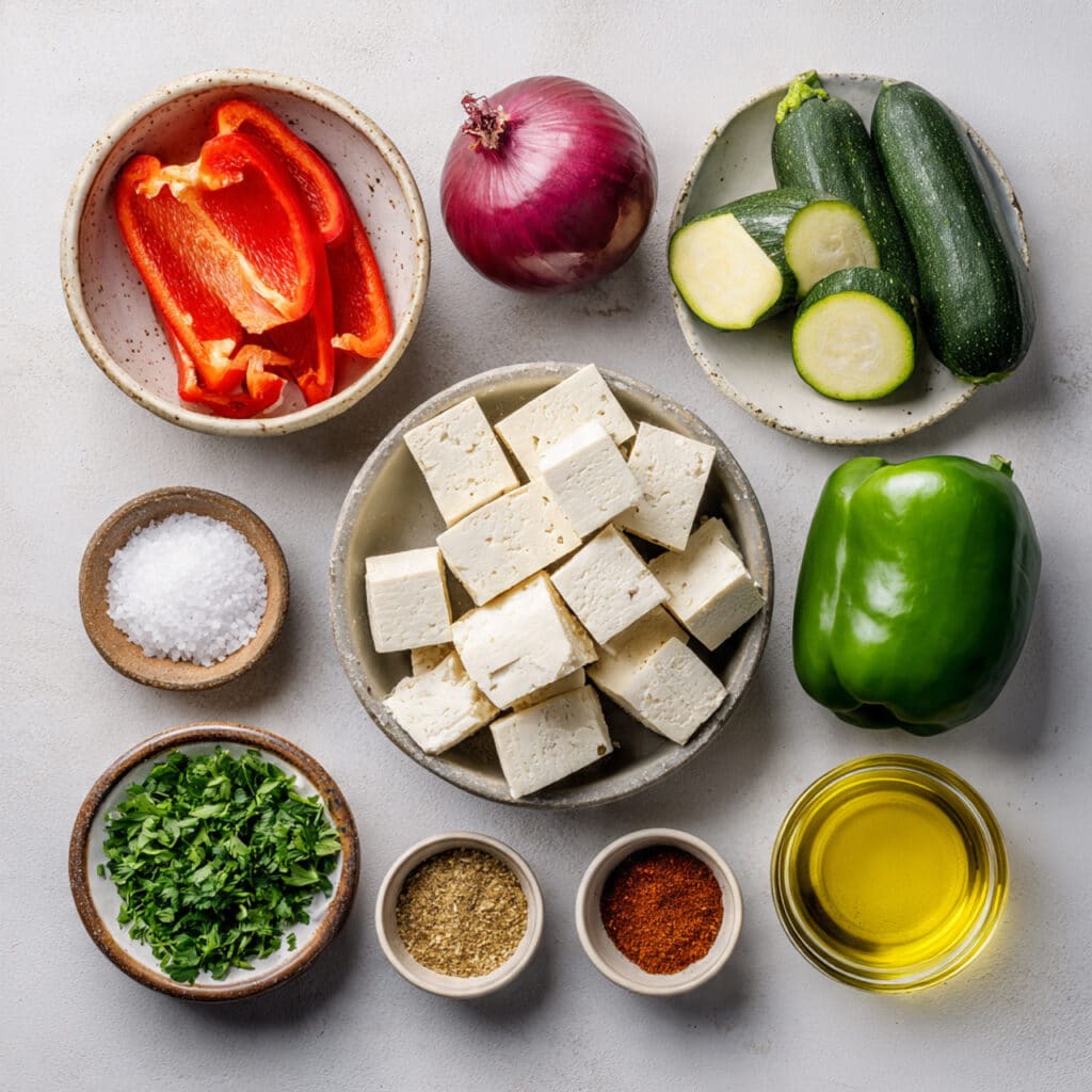 - Assemble the Dish: Thread tofu, peppers, zucchini, and onion onto skewers, alternating for color and balance