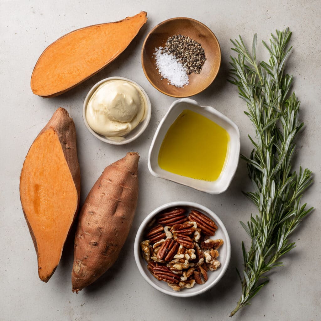 The outside edges develop a slight crispiness while the inner layers remain soft and buttery. The glaze forms a glossy coat that’s sticky, sweet, and salty. The crunch of the toasted pecans against the creamy potatoes makes every bite exciting, while rosemary adds a burst of herbal brightness.