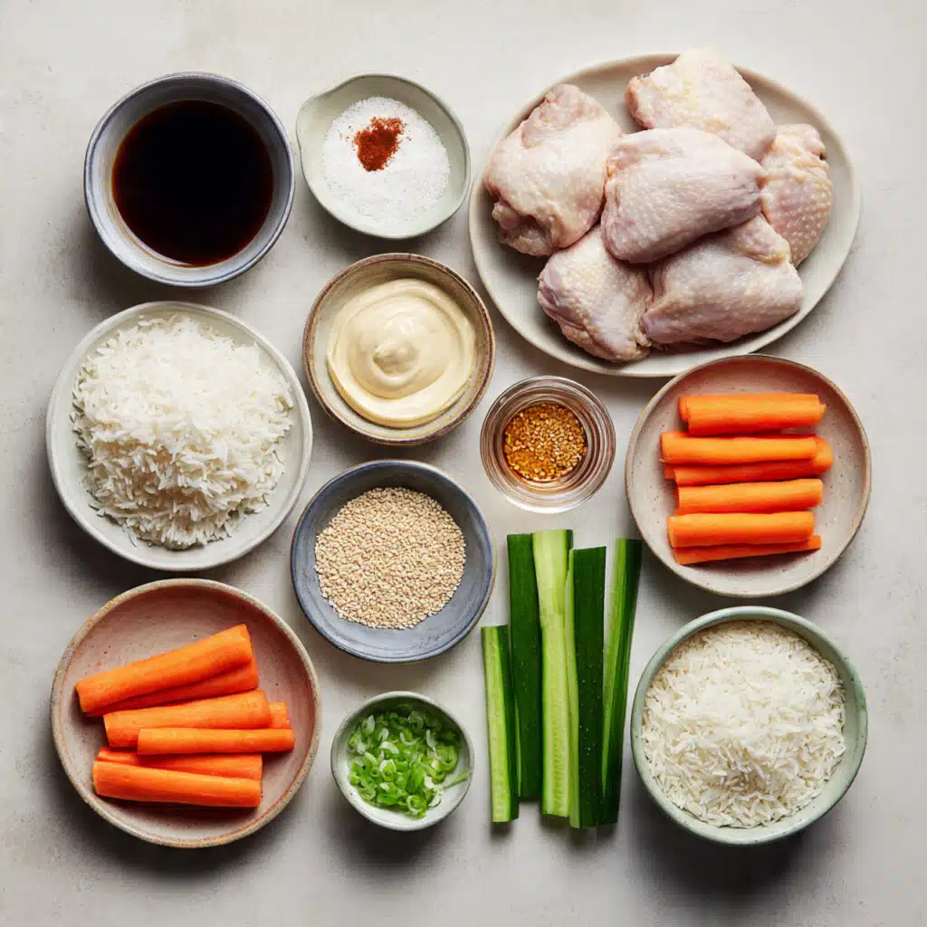 - Serve and Enjoy: Place rice in bowls, top with chicken, add cucumber, carrots, and finish with sesame seeds and green onions