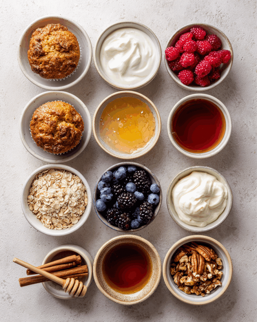Greek Yogurt: Thick, creamy, and slightly tangy, it brings a luxurious mouthfeel and balances the sweetness from the muffins and fruit.