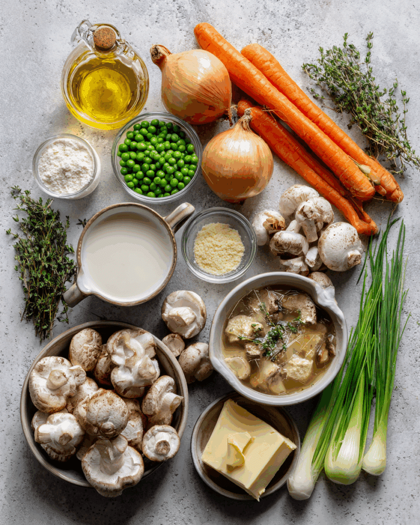 Heat olive oil in your oven-safe pan over medium heat. Add onion, garlic, carrots, celery, and mushrooms. Cook until softened. Stir in flour, then pour in broth. Add peas, thyme, salt, and pepper. Simmer for 5 minutes until slightly thickened. - Prepare Your Cooking Vessel: