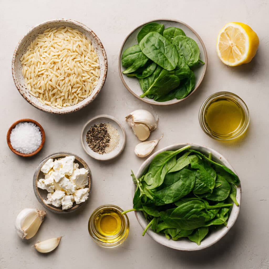 A creamy, bright, and comforting one-pan orzo dish with fresh spinach, zesty lemon, and crumbled feta cheese.