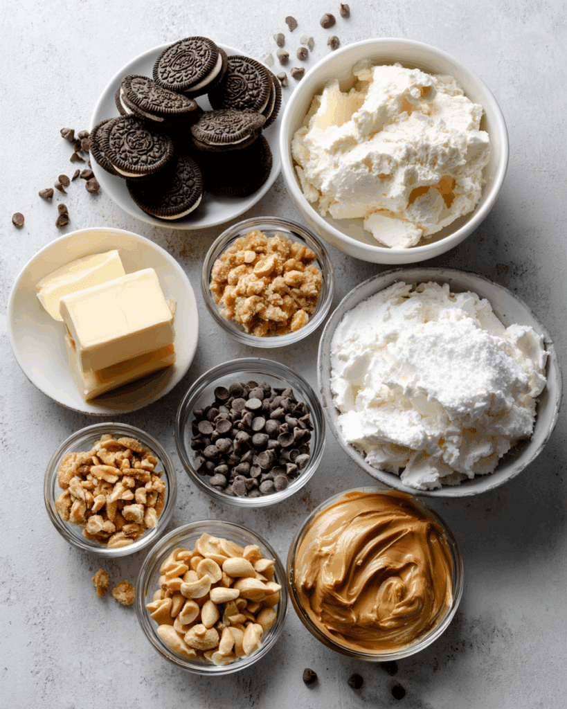 - Combine Ingredients: Mix crushed Oreos with melted butter and press into the pie dish to form the crust. In another bowl, beat cream cheese, peanut butter, and powdered sugar until smooth, then fold in the whipped topping.