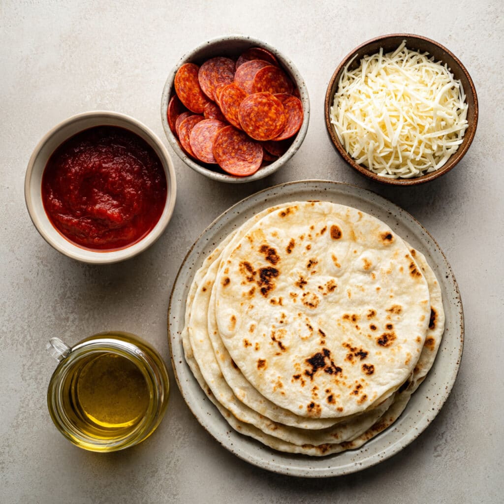 - Flour Tortillas: 4 large tortillas, these act as the crispy base and hold everything together.