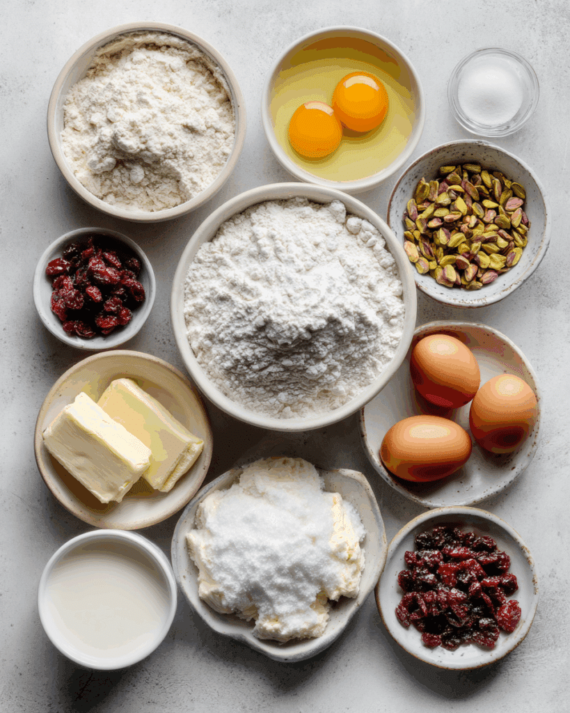 In a large bowl, cream together the butter and powdered sugar until fluffy. Add the egg yolks, heavy cream, and vanilla extract. In another bowl, whisk together flour, cornstarch, and salt. Gradually mix the dry into the wet until just combined. Fold in chopped pistachios and cranberries. - Prepare Your Cooking Vessel: