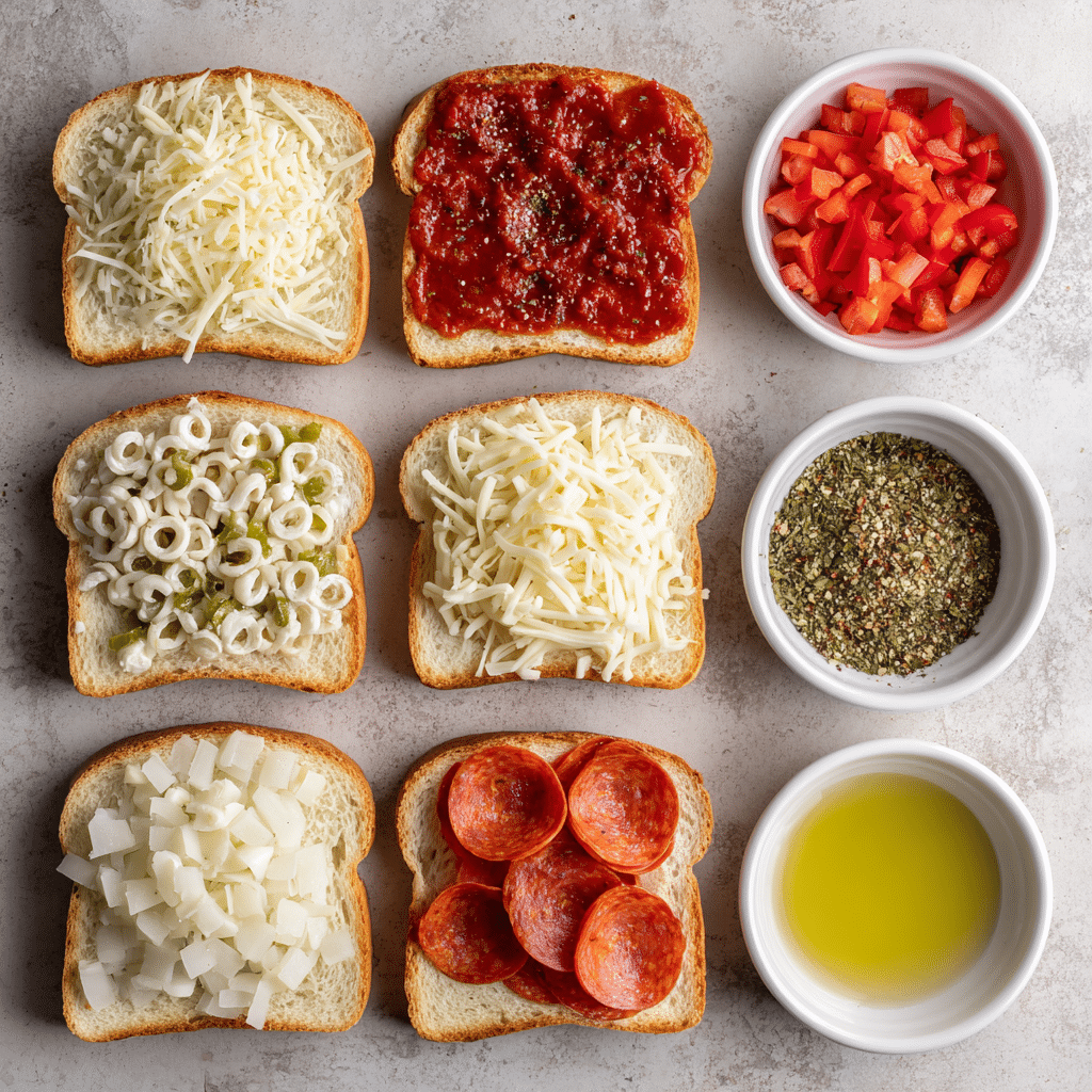 - Assemble the Dish: Spread sauce on each slice of bread, sprinkle cheese, add toppings, and a final dash of oregano.