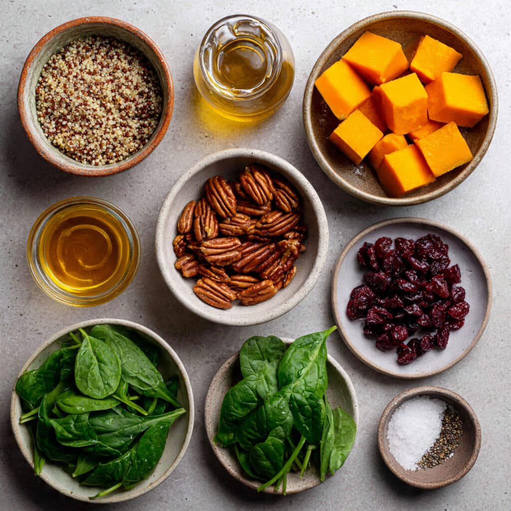 - Finishing Touches: In a large bowl, combine quinoa, roasted pumpkin, pecans, cranberries, and spinach. Drizzle with remaining olive oil and maple syrup, then toss gently.