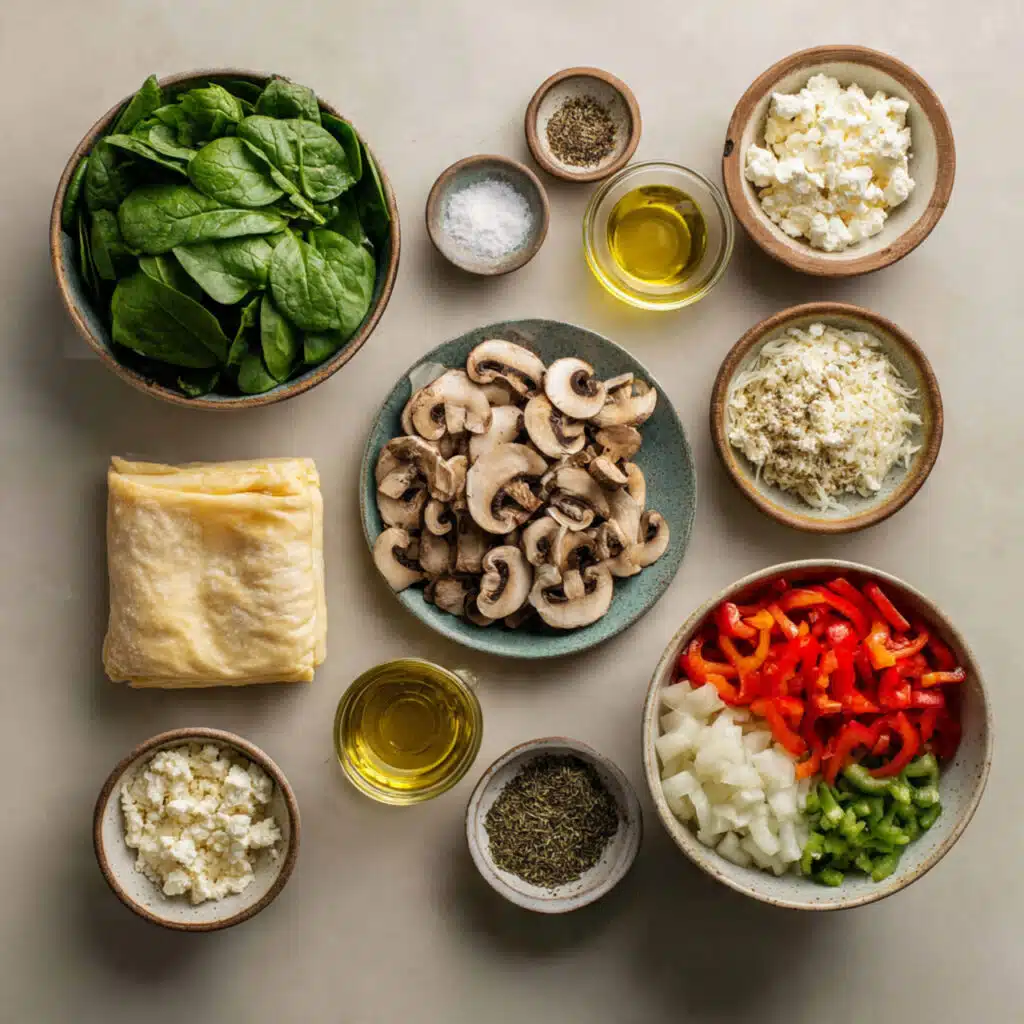 A golden, flaky savory veggie strudel filled with sautéed spinach, mushrooms, bell peppers, and creamy feta, perfect for a comforting and satisfying meal.