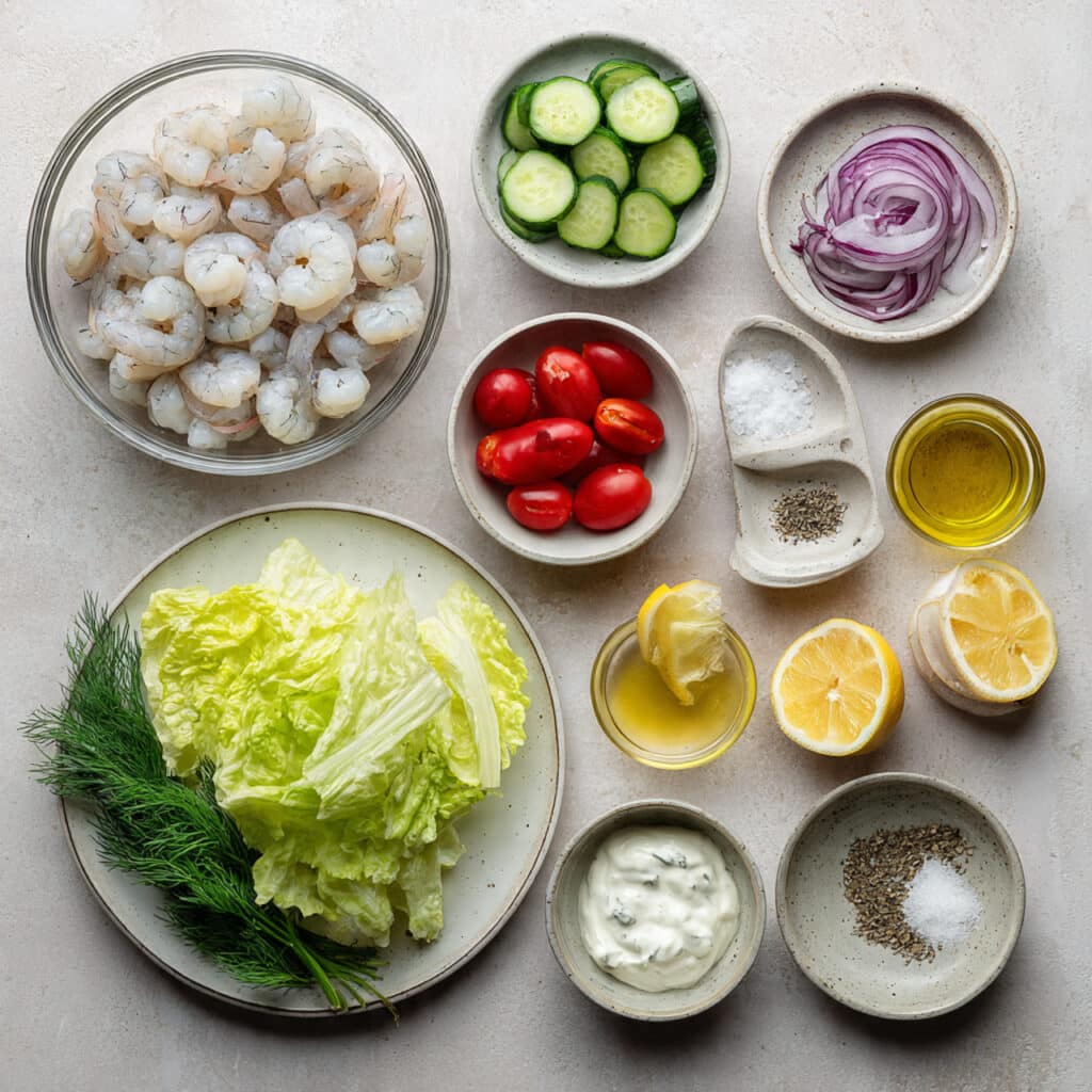 - Assemble the Dish: In a large bowl, combine lettuce, cucumber, tomatoes, red onion, and dill. Add the cooled shrimp.
