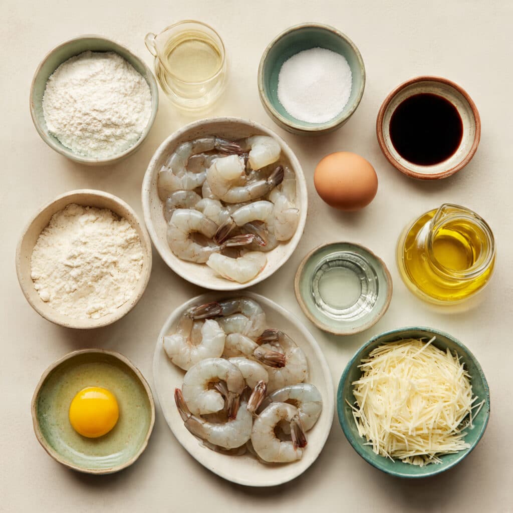 - Raw Shrimp: 1 pound, peeled and deveined with tails on. Shrimp are the star here — keep them cold until ready to fry.