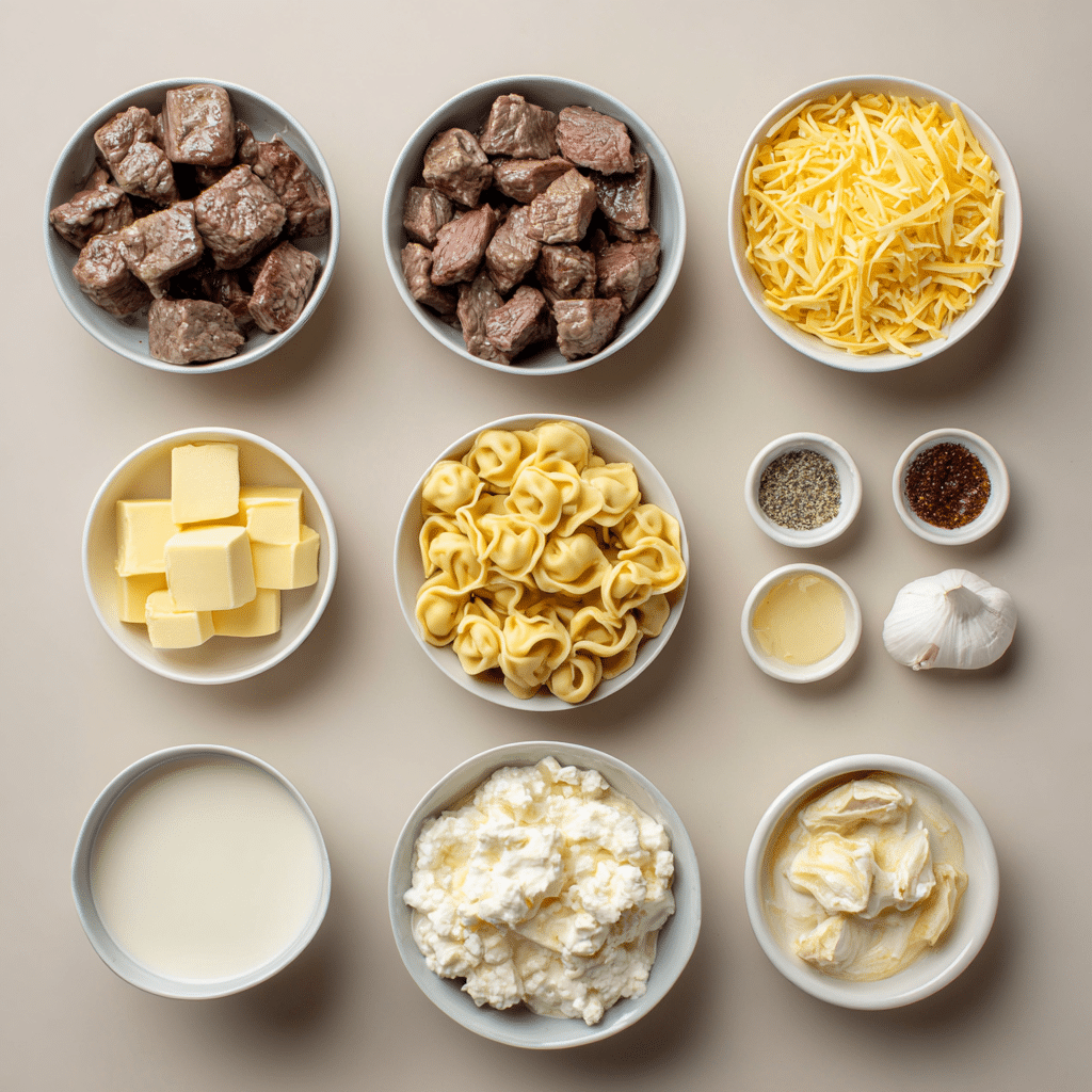 Ingredients in Smothered Steak Bites in Creamy Velveeta Tortellini